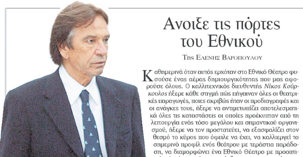 »Ο καλλιτεχνικός διευθυντής Νίκος Κούρκουλος ήξερε κάθε στιγμή πώς πήγαιναν όλες οι θεατρικές παραγωγές, ποιες ακριβώς ήταν οι προδιαγραφές και οι ανάγκες τους, ήξερε να αντιμετωπίζει αποτελεσματικά όλες τις καταστάσεις οι οποίες προέκυπταν από τη λειτουργία ενός τόσο μεγάλου και σημαντικού οργανισμού, ήξερε να τον προστατεύει, να εξασφαλίζει στον θεσμό το κύρος που όφειλε να έχει, να καλλιεργεί το σημερινό προφίλ ενός θεάτρου με τεράστια παράδοση, να διαμορφώνει ένα Εθνικό Θέατρο με προοπτικές.