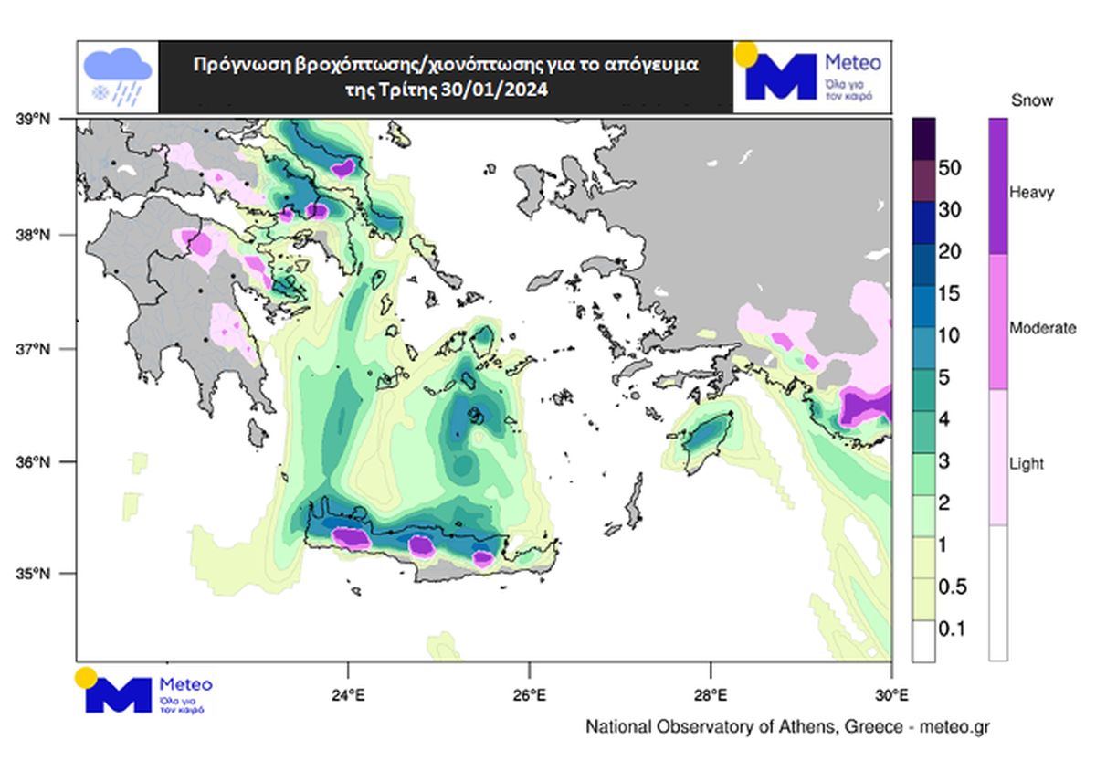 Χάρτης 1: Η βροχόπτωση (πράσινες αποχρώσεις) και η χιονόπτωση (μωβ αποχρώσεις) που αναμένεται το απόγευμα της Τρίτης 30/01