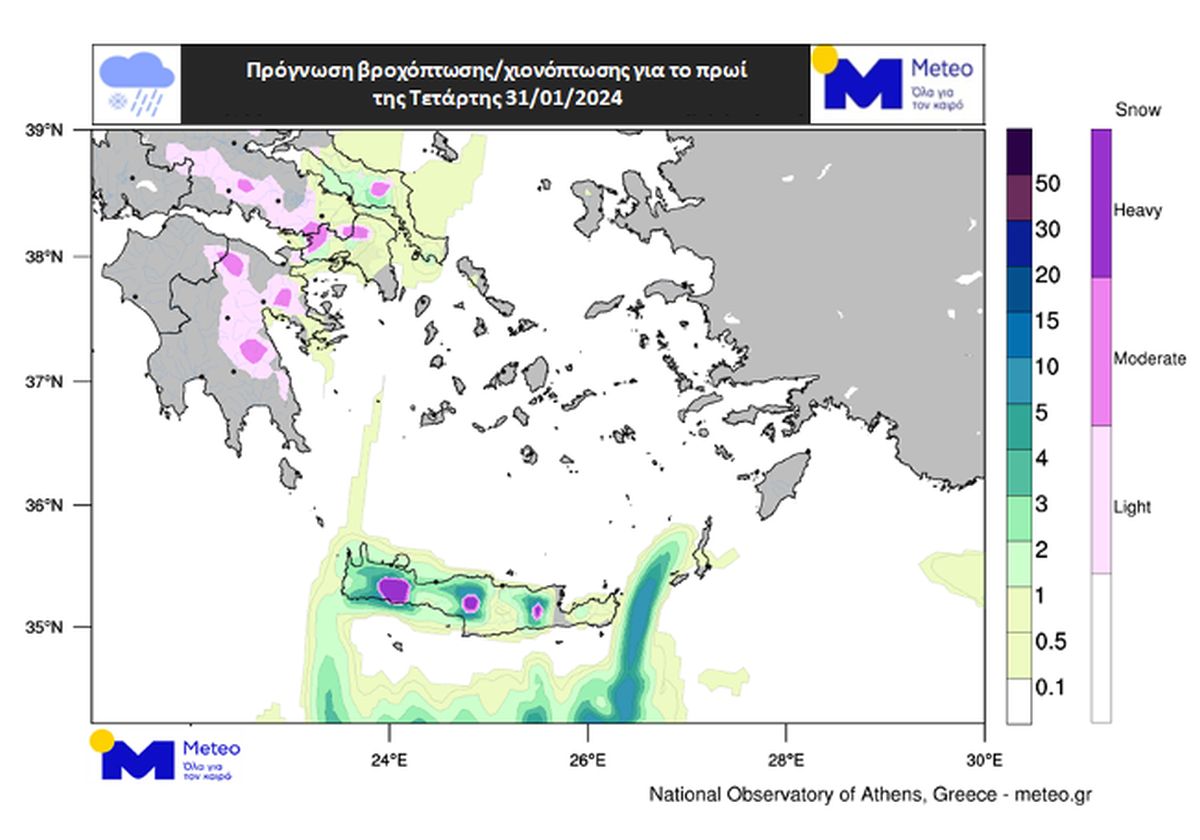 Χάρτης 2: Η βροχόπτωση (πράσινες αποχρώσεις) και η χιονόπτωση (μωβ αποχρώσεις) που αναμένεται το πρωί της Τετάρτης 31/01