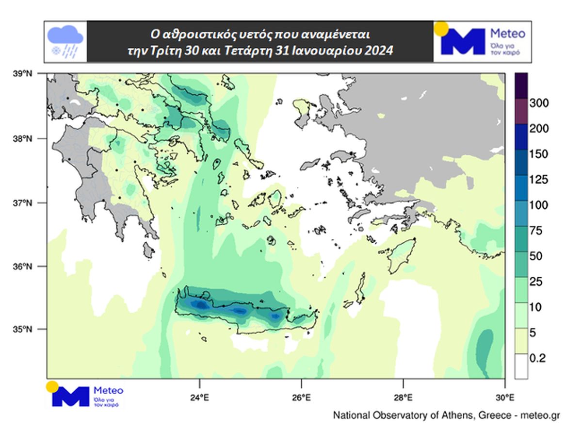 Χάρτης 3: Ο αθροιστικός υετός (βροχή / χιόνι) που αναμένεται την Τρίτη 30/01 και Τετάρτη 31/01