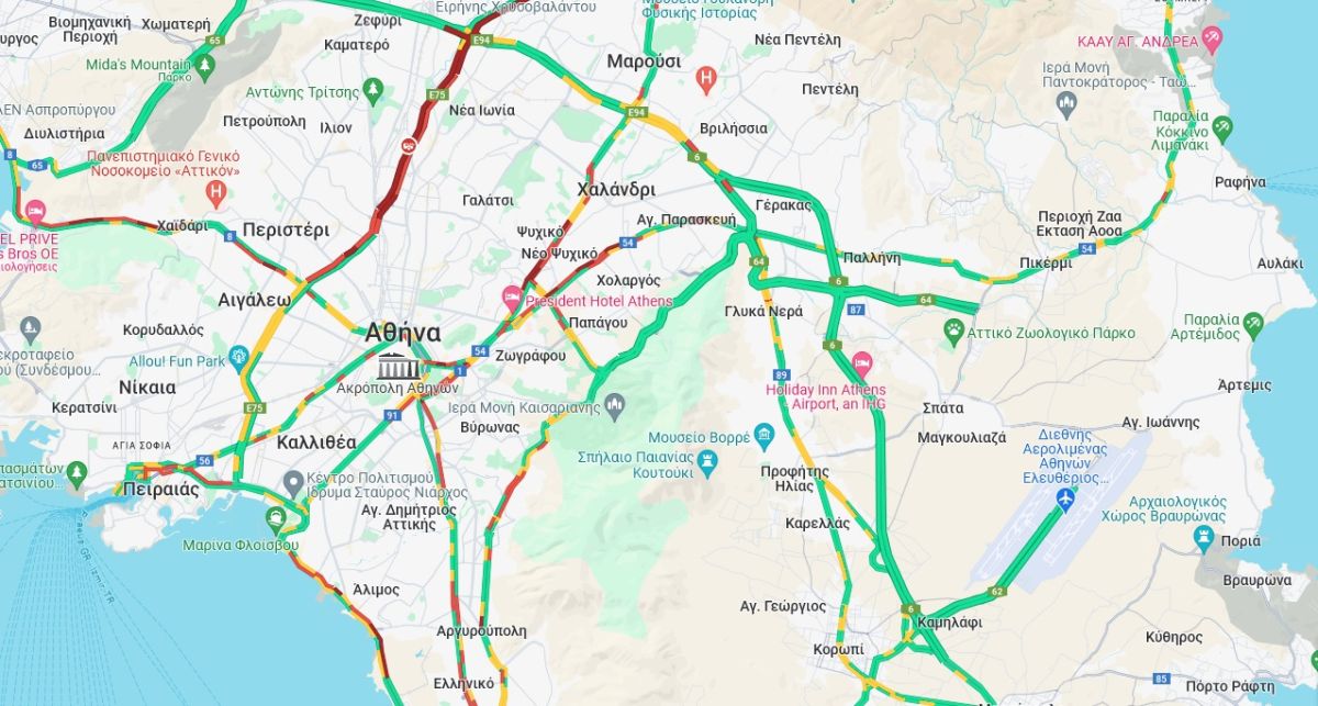 Στο κόκκινο βρίσκεται, όπως κάθε μέρα, ο Κηφισός και στα δύο ρεύματα κυκλοφορίας, αλλά και η έξοδος της Αθηνών-Κορίνθου από Χαϊδάρι έως Διυλιστήρια. Με βάση την τελευταία ενημέρωση της Τροχαίας υπάρχει αυξημένη κίνηση σε Μεσογείων, και στα δύο ρεύματα της Κηφισίας και στην Παραλιακή.