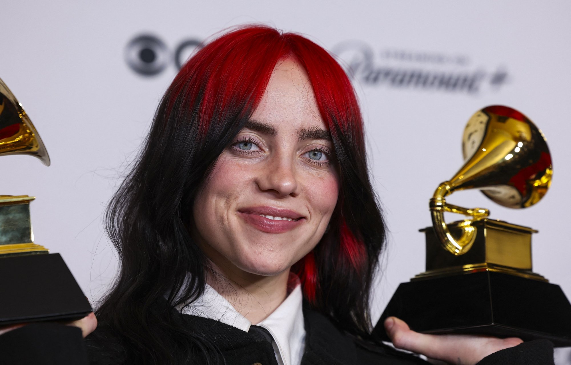 Η Billie Eilish ποζάρει με το βραβείο για το τραγούδι της χρονιάς και το βραβείο για το καλύτερο τραγούδι γραμμένο για οπτικά μέσα.