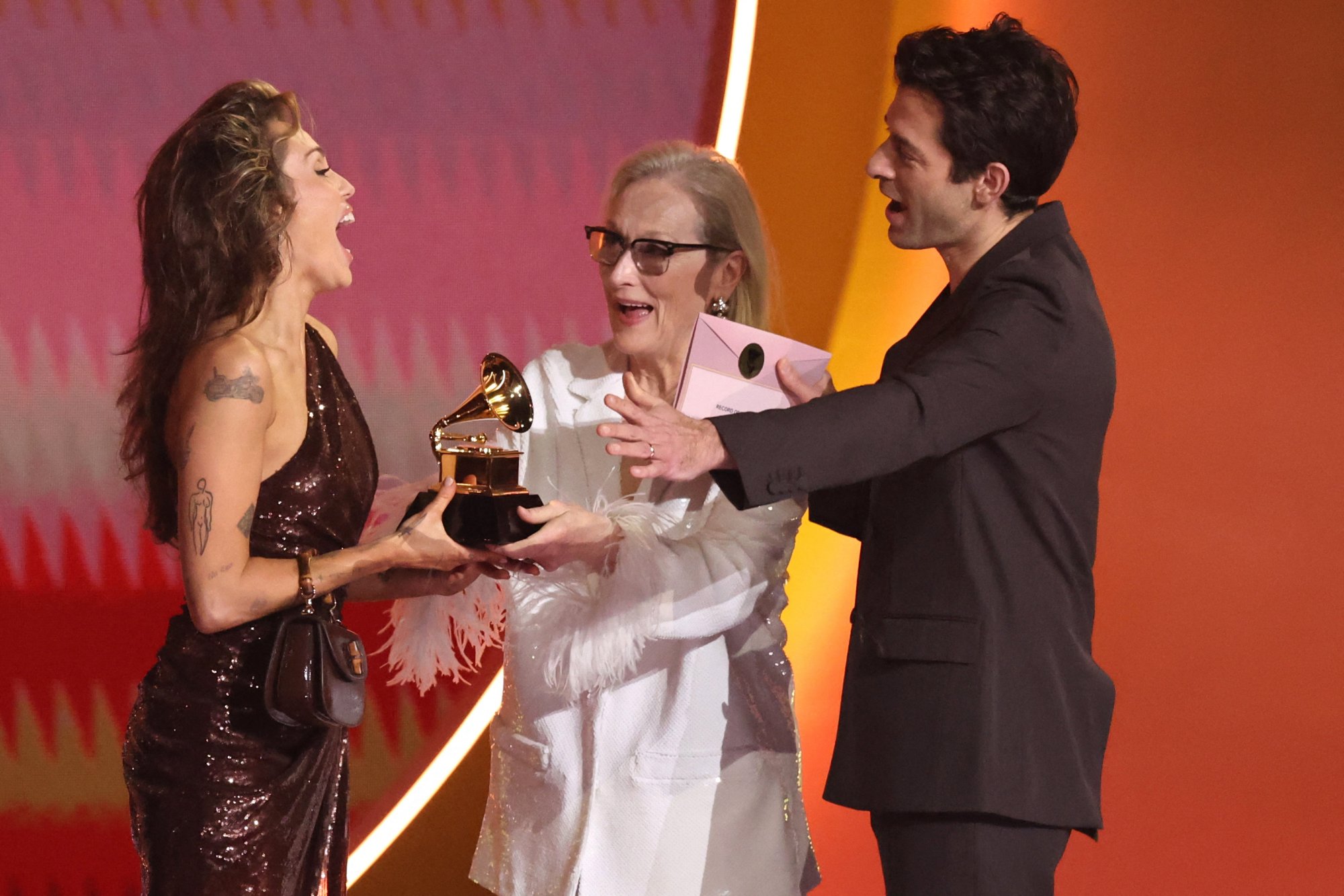 Η Miley Cyrus παραλαμβάνει το βραβείο για τον δίσκο της χρονιάς από τους Mark Ronson και Meryl Streep.