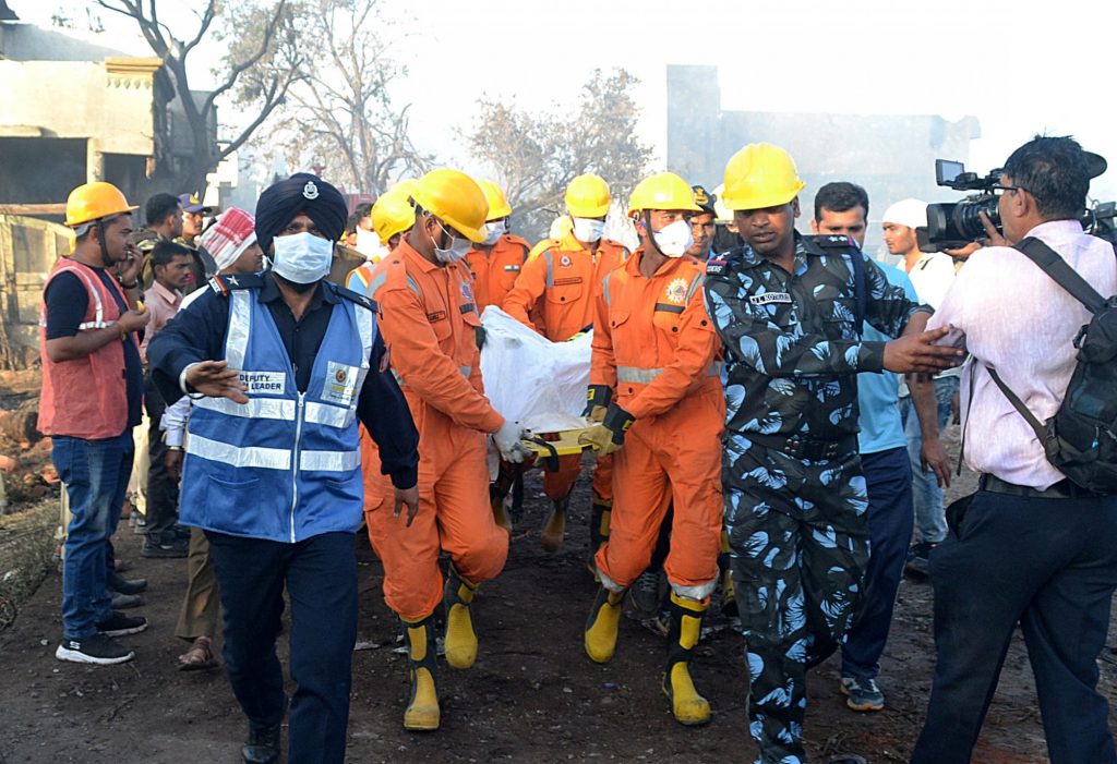 Διασώστες μεταφέρουν σορούς θυμάτων, μετά από έκρηξη σε εργοστάσιο της Ινδίας. (φωτ. Reuters)