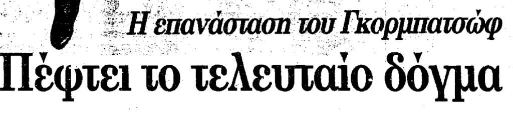 »Από την ιστορική συνεδρίαση της Κεντρικής Επιτροπής του ΚΚΣΕ την περασμένη εβδομάδα κατέστη εμφανές ότι κύριο μέλημα του σοβιετικού ηγέτη δεν ήταν να περισώσει τον κομμουνισμό ως έχει, αλλά κυρίως, να σώσει την πατρίδα του από το χάος που την απειλεί.