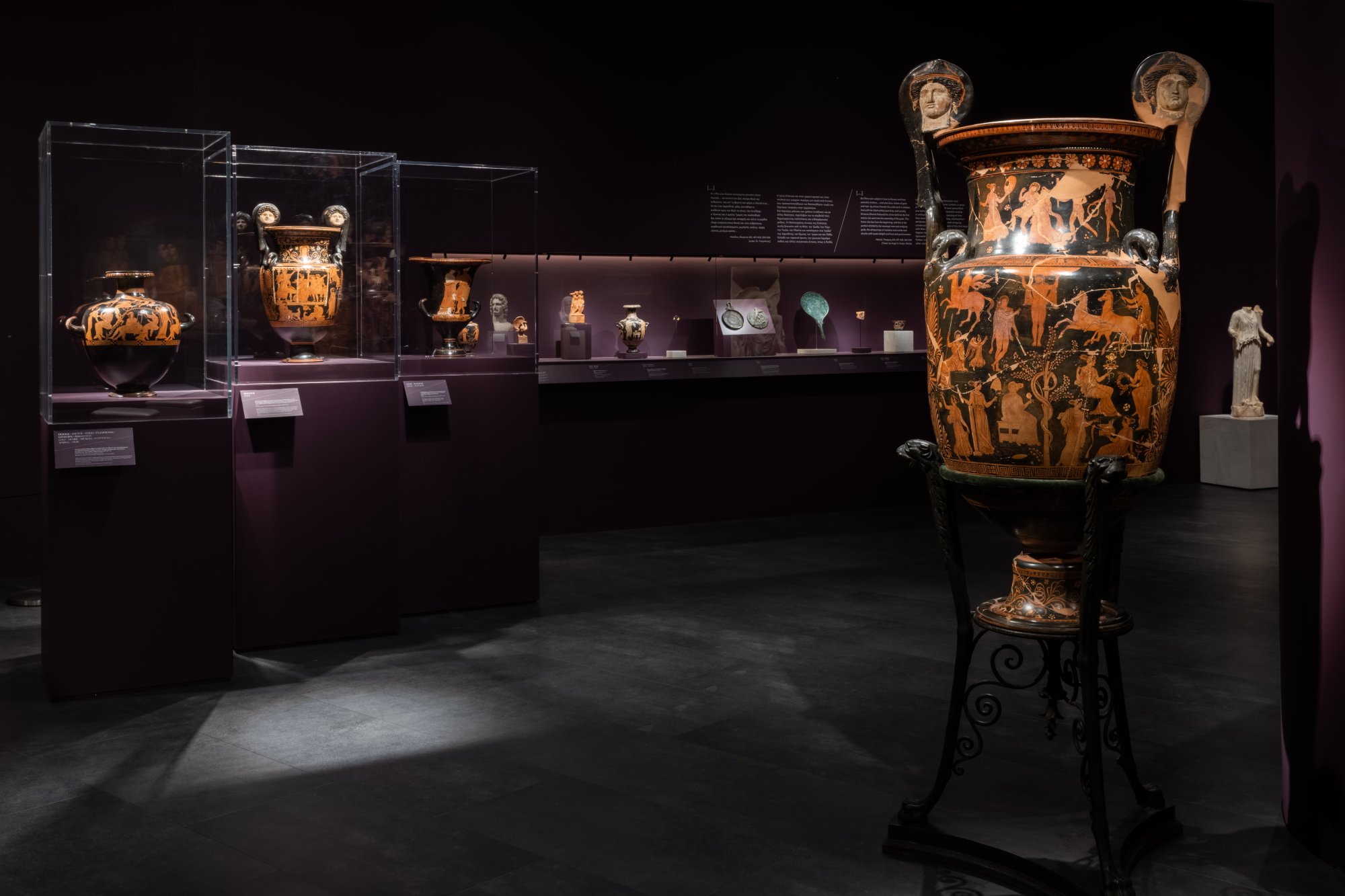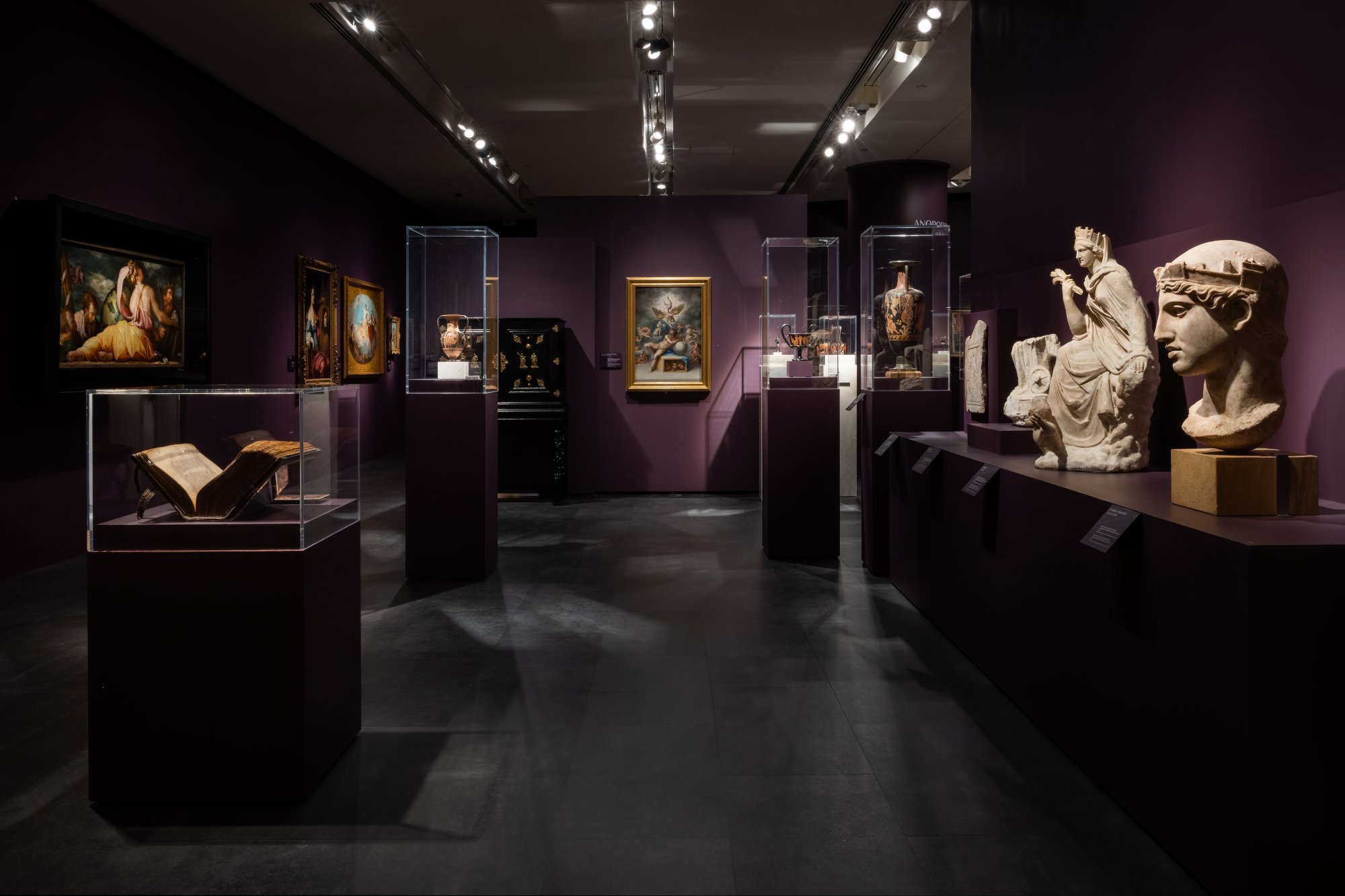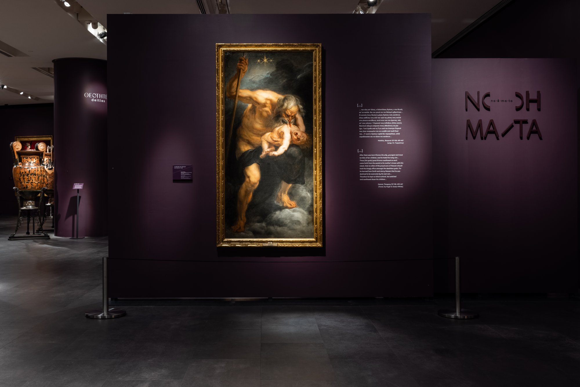 Στα περίοπτα εκθέματα συνυπολογίζονται το έργο του Ζωγράφου του Μειδία σε ένα αγγείο από το Βρετανικό Μουσείο, ο περίφημος πίνακας του Ρούμπενς «Ο Κρόνος καταβροχθίζει τον γιο του» από το Μουσείο Πράδο της Μαδρίτης, η προσωποποιημένη Ζωγραφική του Bourdon από ιδιωτική Συλλογή της Ρώμης, το χάλκινο αγαλμάτιο του Ύπνου από το Kunsthistorisches Museum της Βιέννης.
