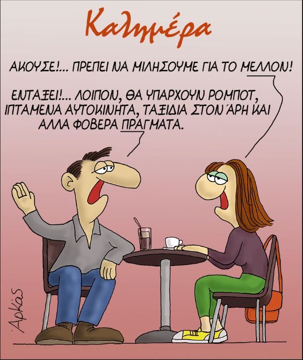 «Εντάξει» απαντά αποδεχόμενος το θέμα της συζήτησης που έθεσε η σύντροφός του και συνεχίζει: «Θα υπάρχουν ρομπότ, ιπτάμενα αυτοκίνητα, ταξίδια στον Αρη και άλλα φοβερά πράγματα».