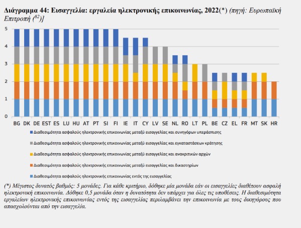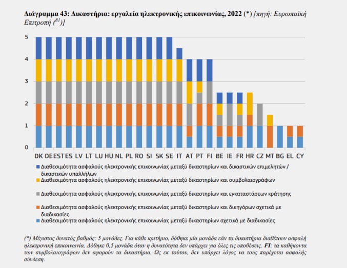 Μάλιστα, σε σύγκριση με τις υπόλοιπες Ευρωπαϊκές χώρες, η Ελλάδα καταλαμβάνει τις τελευταίες θέσεις όσον αφορά την ψηφιοποίηση της Δικαιοσύνης όπως παρουσιάζεται στα διαγράμματα του EU Justice Scoreboard για το 2023. Αξιοσημείωτο είναι το γεγονός ότι στις ψηφιακές λύσεις για τη διεξαγωγή και της παρακολούθησης της δικαστικής διαδικασίας σε ποινικές υποθέσεις, η Ελλάδα δεν λαμβάνει ούτε έναν βαθμό για κανένα από τα κριτήρια που προβλέπονται στην έκθεση.
