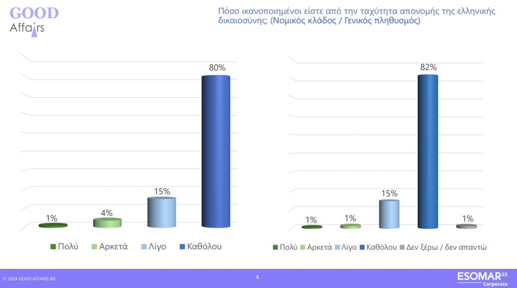Στο πλαίσιο της εκδήλωσης παρουσιάστηκε επίσης σχετική έρευνα της εταιρείας Good Affairs, από τον αναλυτή δεδομένων Γιώργο Τράπαλη, στην οποία καταγράφεται, μεταξύ άλλων ενδιαφερόντων στοιχείων, πως η συντριπτική πλειοψηφία των ερωτηθέντων δεν είναι καθόλου ικανοποιημένη από την ταχύτητα απονομής δικαιοσύνης, σε ποσοστό μάλιστα που αγγίζει το 82%.