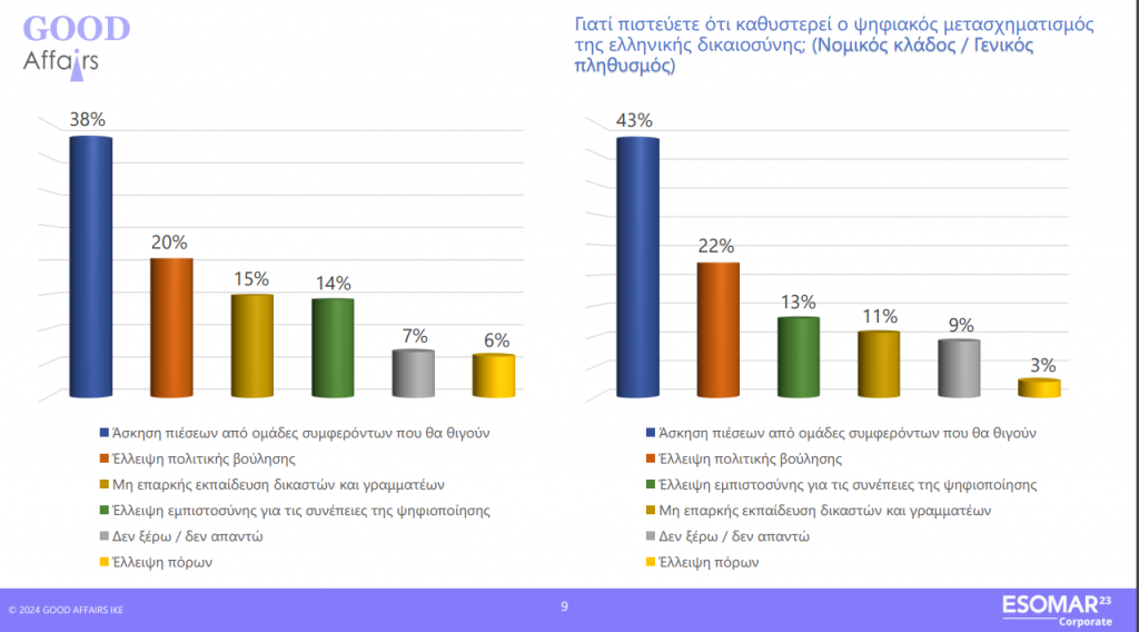 Η άσκηση πιέσεων από ομάδες συμφερόντων που θα θιγούν, αλλά και η έλλειψη πολιτικής βούλησης είναι οι δύο κύριες αιτίες καθυστέρησης του ψηφιακού μετασχηματισμούς της Δικαιοσύνης, σύμφωνα τόσο με τον γενικό πληθυσμό όσο και μεταξύ των ερωτηθέντων που προέρχονται από τον νομικό κλάδο.