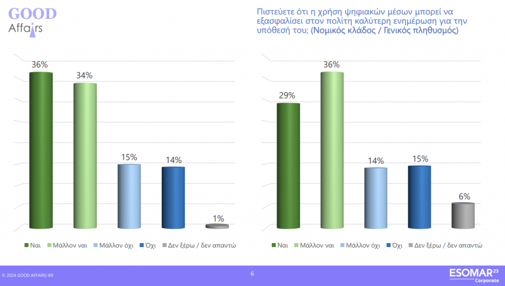 Παράλληλα, στην ίδια έρευνα καταδεικνύεται πως η χρήση ψηφιακών μέσων από τους φορείς της Δικαιοσύνης στη χώρα μας αποτελεί τη μοναδική ελπίδα των πολιτών για να επισπευθούν οι διαδικασίες. Πιο συγκεκριμένα, το 29% του γενικού πληθυσμού απαντάει η χρήση των ψηφιακών μέσων μπορεί να εξασφαλίσει στον πολίτη καλύτερη ενημέρωση για την υπόθεση του, ενώ το 36% απαντά μάλλον ναι, πράγμα που μας οδηγεί στο συγκεντρωτικό ποσοστό του 65%.