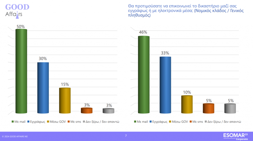 Επιπλέον, το 46% των ερωτηθέντων απαντάει πως θα προτιμούσε το δικαστήριο να επικοινωνεί μαζί τους μέσω e-mail, αφήνοντας αρκετά πίσω, με 33% τον έγγραφο τρόπο. Το 10% επιλέγει την επικοινωνία μέσω GOV, ενώ το 5% με sms. Συνολικά τα ψηφιακά μέσα αθροίζουν ποσοστό της τάξης του 61%.