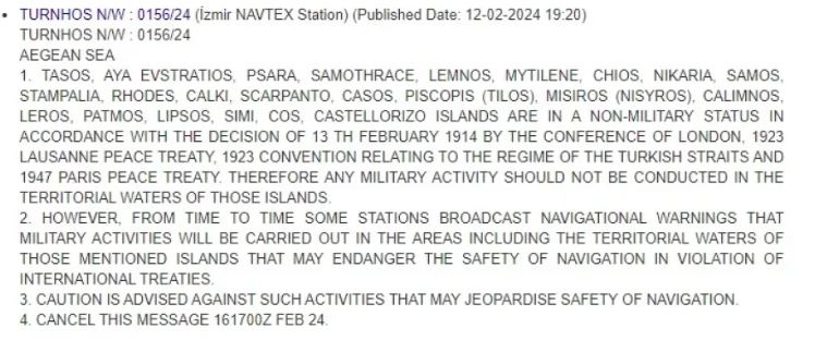 «Τα νησιά Θάσος, Άγιος Ευστράτιος, Ψαρά, Σαμοθράκη, Λήμνος, Λέσβος, Χίος, Ικαρία, Σαμος, Αστυπάλαια, Ρόδος, Χάλκη, Κάρπαθος, Κάσος, Τήλος, Νίσυρος, Κάλυμνος, Λέρoς, Πάτμος, Λειψοί, Σύμη, Κως, Καστελόριζο βρίσκονται σε αποστρατιωτικοποιημένο καθεστώς σύμφωνα με τις αποφάσεις του 1914 των έξι μεγάλων δυνάμεων, τη Συνθήκη της Λωζάνης του 1923, σύμφωνα με την συμφωνία των στενών της Λωζάνης του 1923 και σύμφωνα με την συνθήκη των Παρισίων του 1947.