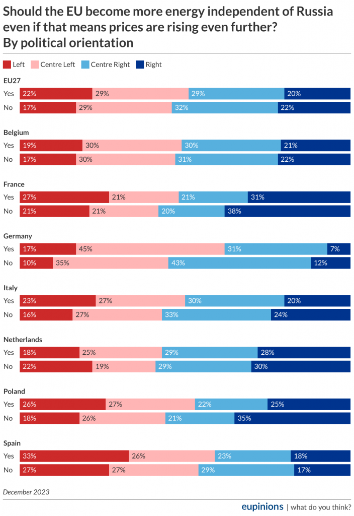 - Όσο για όσους αντιτίθενται στην ενεργειακή ανεξαρτησία σε βάρος της αύξησης των τιμών, η τάση είναι συνεπής. Σε ολόκληρη την ΕΕ και στα περισσότερα κράτη μέλη, η πλειονότητα αυτής της ομάδας προσδιορίζεται ως δεξιά.