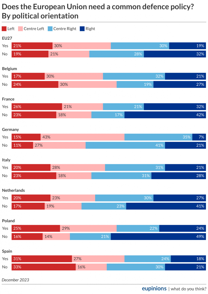 - Η υποστήριξη για μια κοινή αμυντική πολιτική της ΕΕ κατανέμεται αρκετά ομοιόμορφα σε όλο το πολιτικό φάσμα, με μια ελαφρά κλίση προς το κέντρο. Σε πανευρωπαϊκή κλίμακα, το 51% εκφράζει την υποστήριξή του ενώ το 49% είναι αντίθετο. Μεταξύ εκείνων που υποστηρίζουν μια κοινή αμυντική πολιτική, το 60% προσδιορίζονται ως κεντρώοι. Μεταξύ εκείνων που αντιτίθενται σε μια κοινή αμυντική πολιτική, η πλειοψηφία προέρχεται από τη δεξιά πλευρά του πολιτικού φάσματος, αντιπροσωπεύοντας το 60% των ερωτηθέντων, με το 32% να προσδιορίζεται ως δεξιός και το 28% ως κεντροδεξιός.