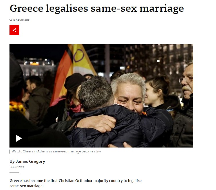 Το BBC αναφέρει σε δημοσίευμά του πως «η Ελλάδα έγινε η πρώτη ορθόδοξη χώρα που νομιμοποίησε τους γάμους ομοφύλων». Στο ίδιο πλαίσιο και η Guardian, που κάνει λόγο για μια ιστορική στιγμή.