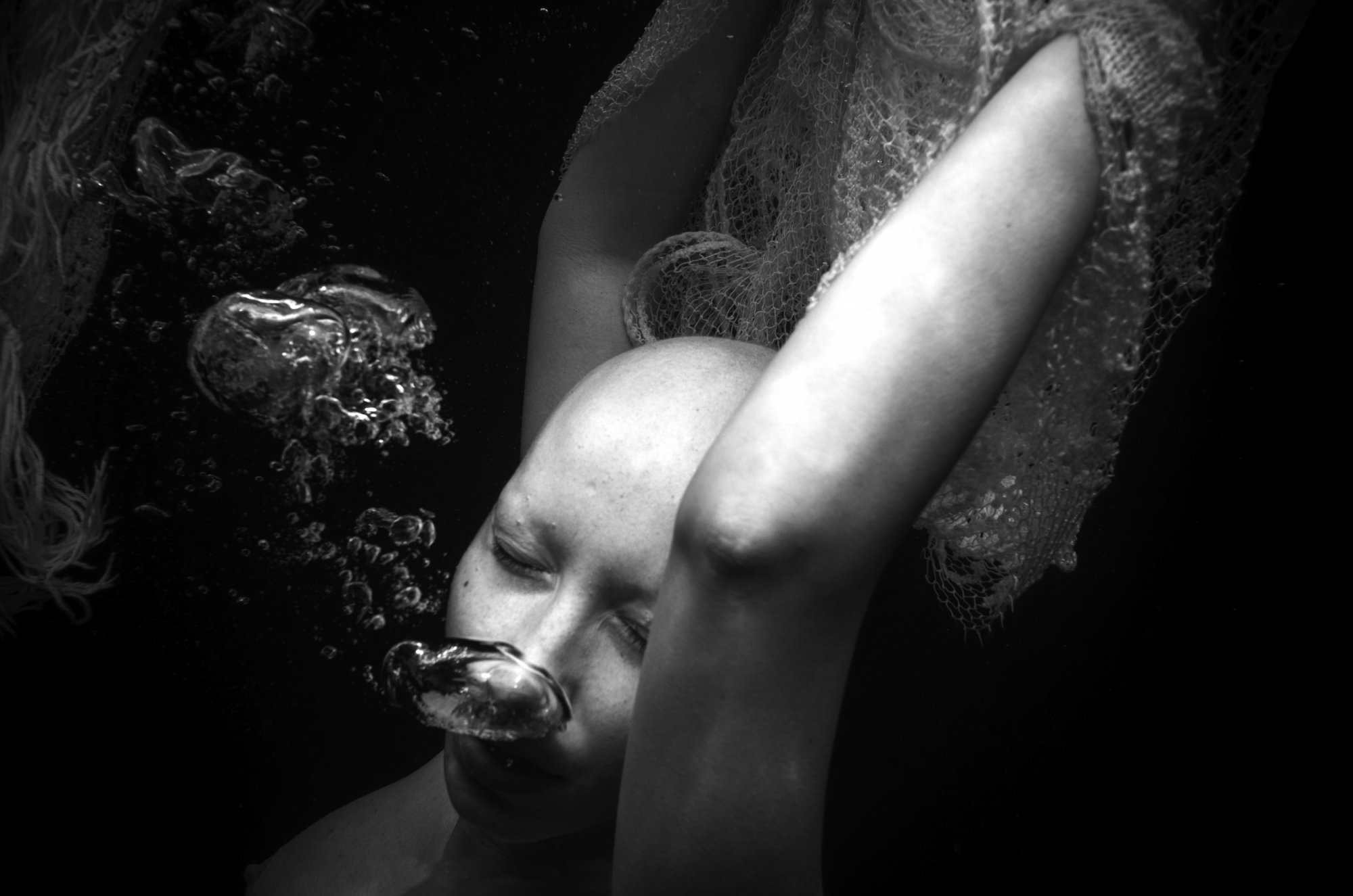 Επειδή αγαπώ το νερό και από μικρή κάνω ελεύθερη κατάδυση σε βάθος, επέλεξα ένα από τα υφάσματα της βαλίτσας για να το βυθίσω στα νερά μιας λίμνης. Παράλληλα έκανα και υποβρύχια πορτρέτα με τη φίλη μου Σταυριάνα Αστραδενή που συμμετέχει και στην έκθεση. Βυθίσαμε το ύφασμα δημιουργώντας μια εικόνα σαν να βρίσκεται ένα πλάσμα μέσα σε μια μήτρα μαζί με το ύφασμα. Ο στόχος, δηλαδή, ήταν να δημιουργήσω μια εικόνα που να μοιάζει σαν να βρίσκεται ένα έμβρυο μέσα σε μια μήτρα μαζί με το ύφασμα, σαν κάτι να μπορεί να αναγεννηθεί ξανά. Με αυτές τις εικόνες και πορτρέτα από τους συγγενείς δημιουργήσαμε με τον επιμελητή Κωστή Αντωνιάδη μία πρώτη μορφή Tehom (Άβυσσος) που πρωτοπαρουσίασε το 2019 στο Φεστιβάλ του Δίου τα υφάσματα που αιωρούνται με την ίδια μορφή σαν να βρίσκονται μέσα στη μήτρα.