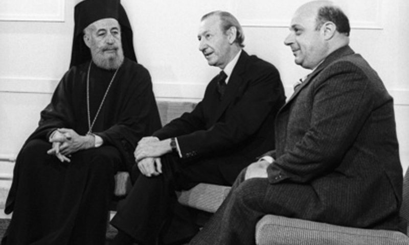 Ο Αρχιεπίσκοπος Μακάριος με τον γ.γ. του ΟΗΕ Κουρτ Βάλντχαϊμ (στη μέση) και τον τουρκοκύπριο Ραούφ Ντενκτάς.
