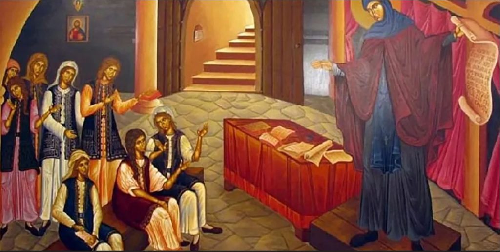 Σ’ όλα αυτά τα ασκητήρια οι καλογρηές δουλεύανε στους αργαλειούς και σε άλλα εργόχειρα, σαν τις προκομμένες μέλισσες μέσα στο κουβέλι. Φτωχά κι ορφανά κορίτσια βρήκανε προστασία κι εργασία μέσα σ’ εκείνα τα καταφύγια. Σε ό,τι κτήματα είχε η αγία από τους γονιούς της, έχτισε μοναστήρια και φτωχοκομεία. Kι είχε πολλή περιουσία.