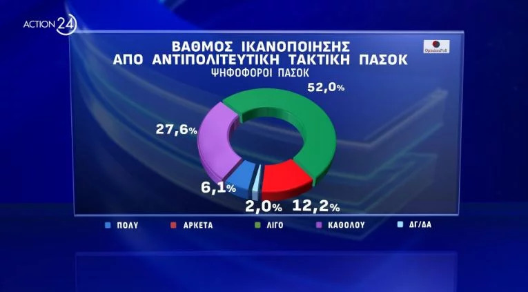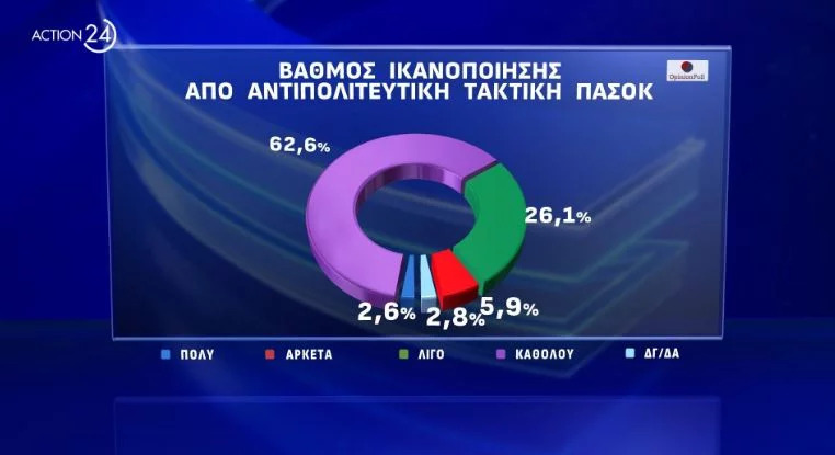Εξάλλου, το 62,6% των ερωτηθέντων στο σύνολο δεν κρίνει καθόλου ικανοποιητικά την αντιπολιτευτική τακτική του ΠΑΣΟΚ έναντι 26,1% που απαντούν θετικά.