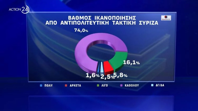 Πάνω από 7 στους 10 (ποσοστό 74%) δηλώνει ότι δεν είναι καθόλου ικανοποιημένο από την αντιπολιτευτική τακτική του ΣΥΡΙΖΑ, έναντι μόλις 16,1% που δηλώνει «λίγο».
