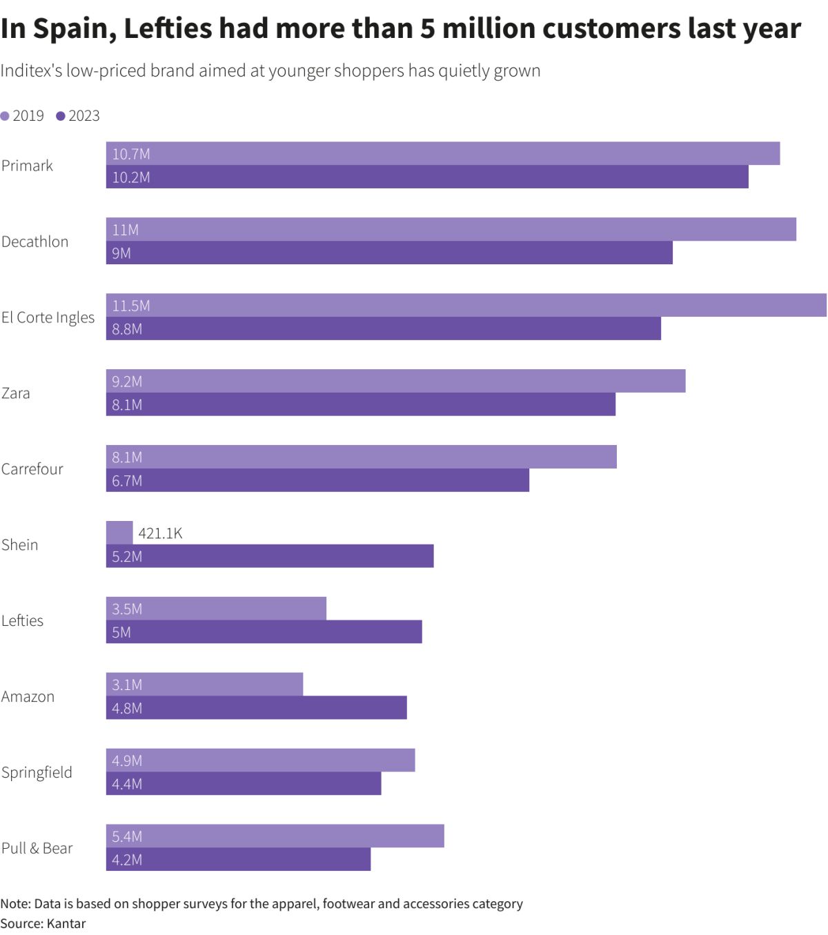Στην Ισπανία, όπου η Lefties έχει 25 καταστήματα σύμφωνα με την ιστοσελίδα της, έχει αυξηθεί από περίπου 3,5 εκατομμύρια πελάτες το 2019 σε 5 εκατομμύρια πελάτες το 2023, τοποθετώντας την ακριβώς πίσω από τη Shein με 5,2 εκατομμύρια, με βάση τις εκτιμήσεις της Kantar.