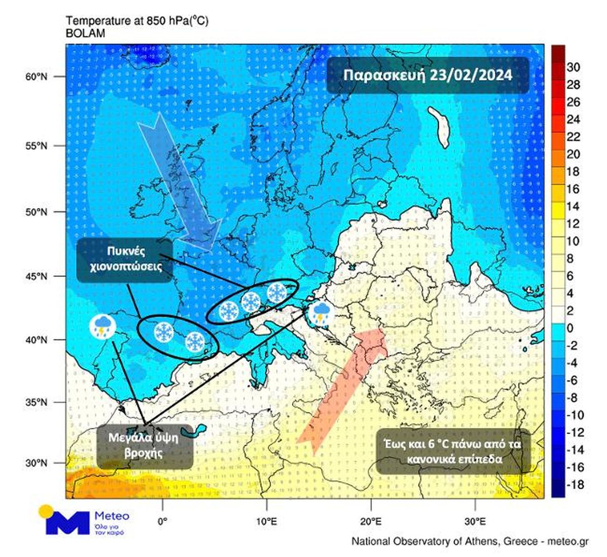 Στον παρακάτω χάρτη με τη θερμοκρασία των αερίων μαζών σε ύψος περίπου 1.500μ. πάνω από τη μέση στάθμη της θάλασσας, βλέπουμε τις ψυχρές αέριες μάζες στη Δυτική Ευρώπη και τις θερμές αέριες μάζες στην Ανατολική Ευρώπη την Παρασκευή 23/2.