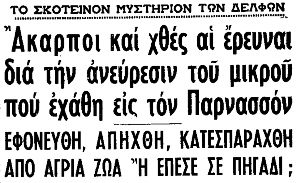 «Τι απέγινε ο μικρός Δημήτρης Καμπής, που έχει εξαφανισθή από το μεσημέρι της περασμένης Παρασκευής εις τον Παρνασσόν; Εφονεύθη; Απήχθη; Κατεσπαράχθη από άγρια ζώα;»