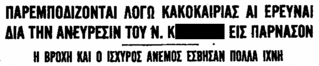 «Τα ερωτήματα αυτά απασχολούν την Χωροφυλακήν και τους κατοίκους της Στερεάς Ελλάδας και ιδιαιτέρως της περιοχής (…) η οποία ερευνάται βήμα προς βήμα από χωροφύλακας, άνδρας των ΤΕΑ, χωρικούς, ακόμη και ελικόπτερα της πολεμικής αεροπορίας».