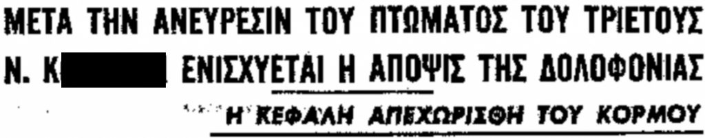 »Το πτώμα ευρέθη κάτωθι ελάτου (…) εις δασώδη και απρόσιτον τοποθεσίαν. Λόγω της αποσυνθέσεως είχον αποχωρισθή η κεφαλή του κορμού, εκ της αιτίας δε ταύτης δεν κατέστη δυνατή η πλήρης εξέτασις υπό των διενεργησάντων επί τόπου την αυτοψίαν, ιατρών».