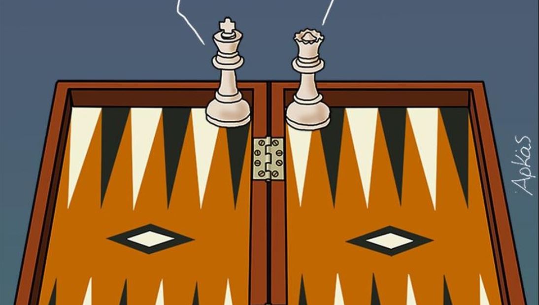 Προς αυτήν την κατεύθυνση ο γνωστός σκιτσογράφος Αρκάς, τοποθετηθεί τον βασιλιά και τη βασίλισσα, – τις δύο κυρίαρχες φιγούρες στα πιόνια του σκάκι, του παιχνιδιού που αρχικά ταυτίστηκε με τη ψυχαγωγία των βασιλέων – να εγκαταλείπουν τη σκακιέρα τους και να μεταφέρονται στο ταμπλό του τάβλι – του παιχνιδιού που κατά βάση επιλέγεται από τα λαϊκά στρώματα και έχει ταυτιστεί με το χώρο των καφενείων.