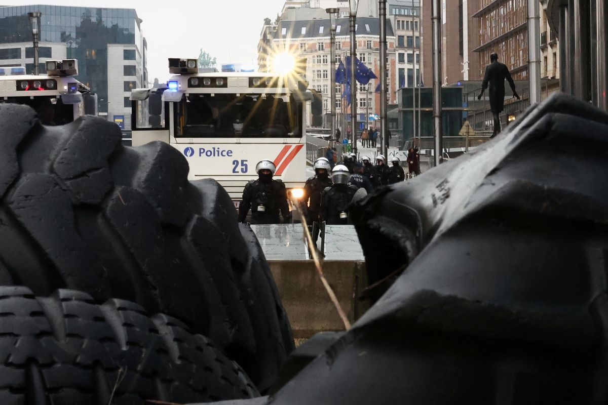 Νωρίτερα, οι αγρότες επιχείρησαν να βάλουν φωτιά σε ένα βουνό από ελαστικά, μερικές εκατοντάδες μέτρα από το κτίριο του Ευρωπαϊκού Συμβουλίου και η Αστυνομία έφερε κανόνια νερού.