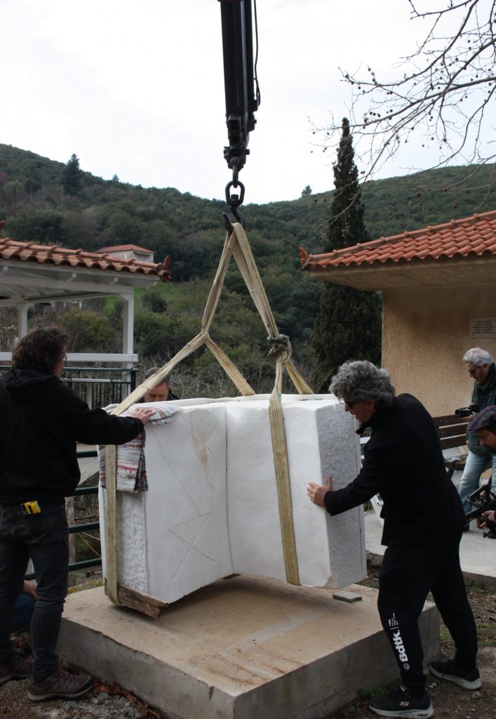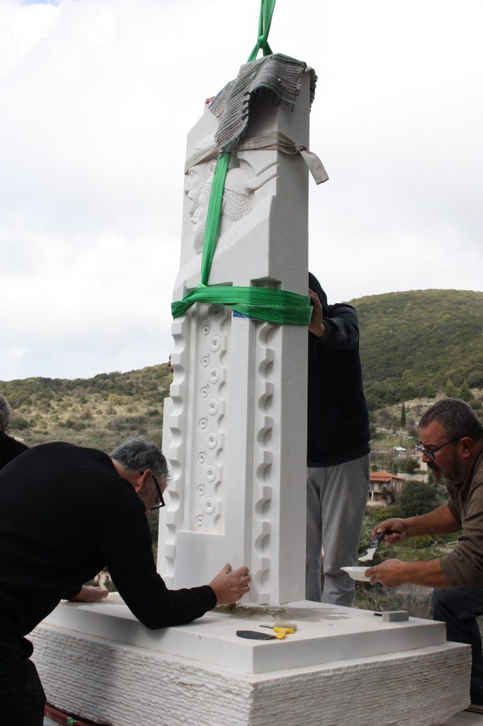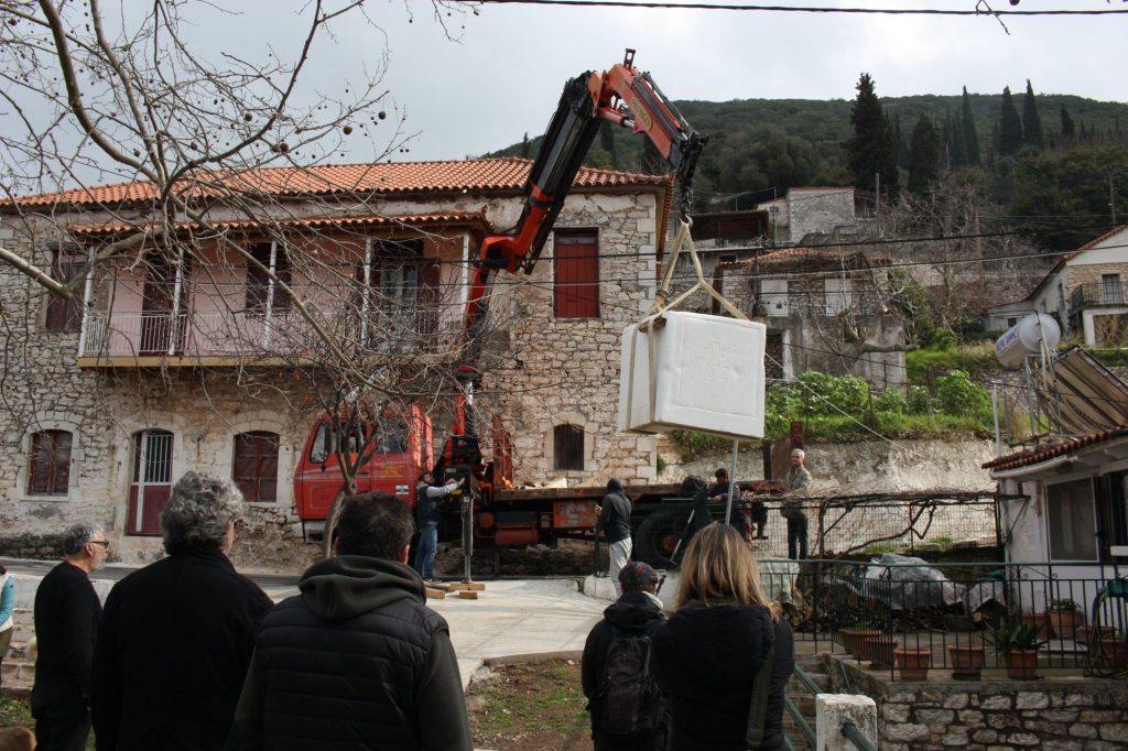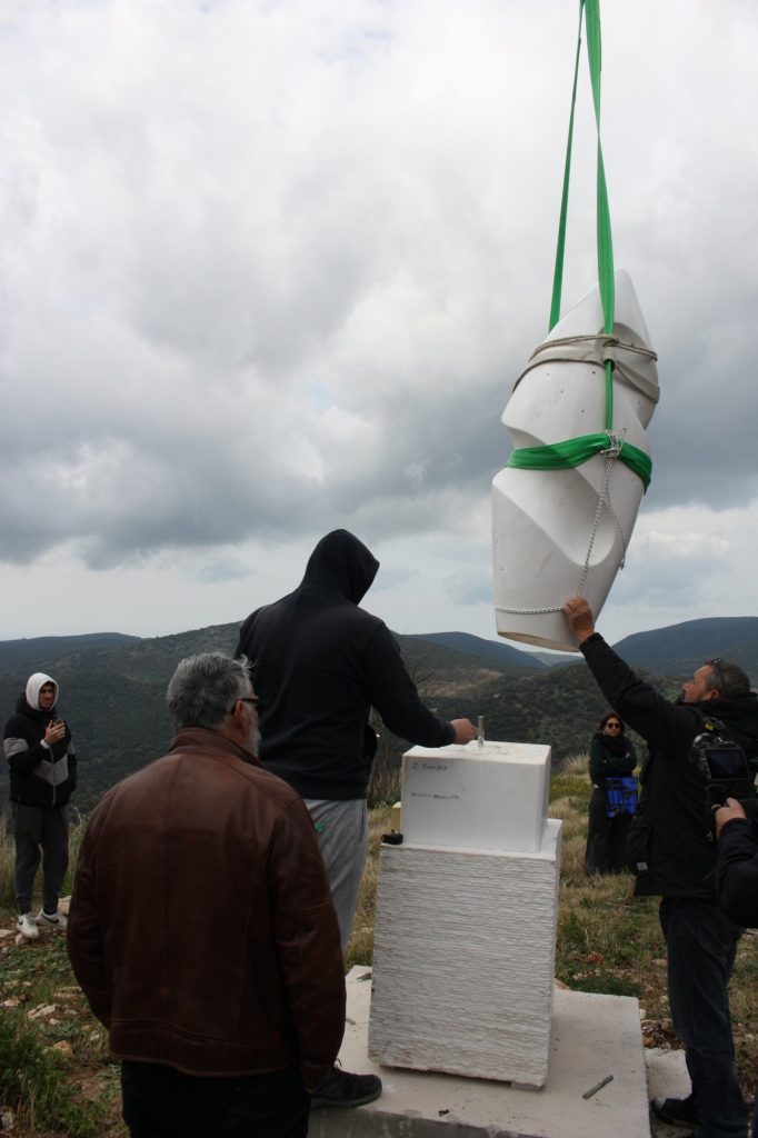 Από νωρίς το πρωί του περασμένου Σαββάτου, οι γλύπτες Γιώργος Σταματόπουλος, Στέλιος Γαβαλάς, ο Γλύπτης – βοηθός Γιώργος Παπασωτηρίου και ο συντηρητής Γιώργος Παγανής – ο «θρύλος του Ιερού βράχου της Ακρόπολης», – συγκεντρώθηκαν στον προαύλιο χώρο του Δημοτικού Σχολείου Κεφαλόβρυσης (Ρίπεσι) και συνεργάστηκαν άρτια στο δύσκολο και απαιτητικό έργο της μεταφοράς και τοποθέτησης των γλυπτών στην τελική τους θέση. Μαζί τους, για άλλη μια φορά, ο πατέρας της «Μύρτιδας» καθηγητής Μανώλης Ι. Παπαγρηγοράκης.