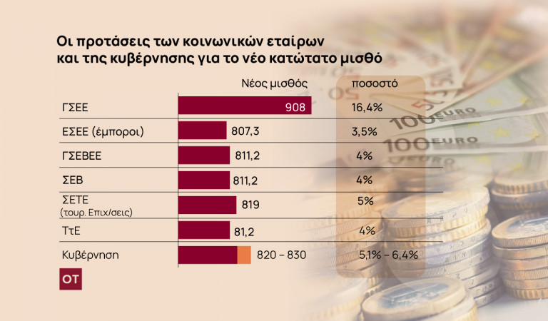 Σύμφωνα με τις προτάσεις που υπέβαλαν οι κοινωνικοί εταίροι οι διαφορές είναι δυσθεώρητες. Οι εργοδοτικοί φορείς προτείνουν αυξήσεις από 3,5% (ΕΣΕΕ) έως 5% (ΣΕΤΕ), δηλαδή νέο κατώτατο μισθό 807,3 ευρώ έως 819 ευρώ. Οι εργοδότες επιμένουν ότι η αύξηση θα πρέπει να κινηθεί χαμηλά με γνώμονα το ύψος του πληθωρισμού του 2023, που ήταν γύρω στο 3,5%. Συγκρατημένη είναι και η πρόταση της Τράπεζας της Ελλάδος η οποία κυμαίνεται γύρω από το 4%.