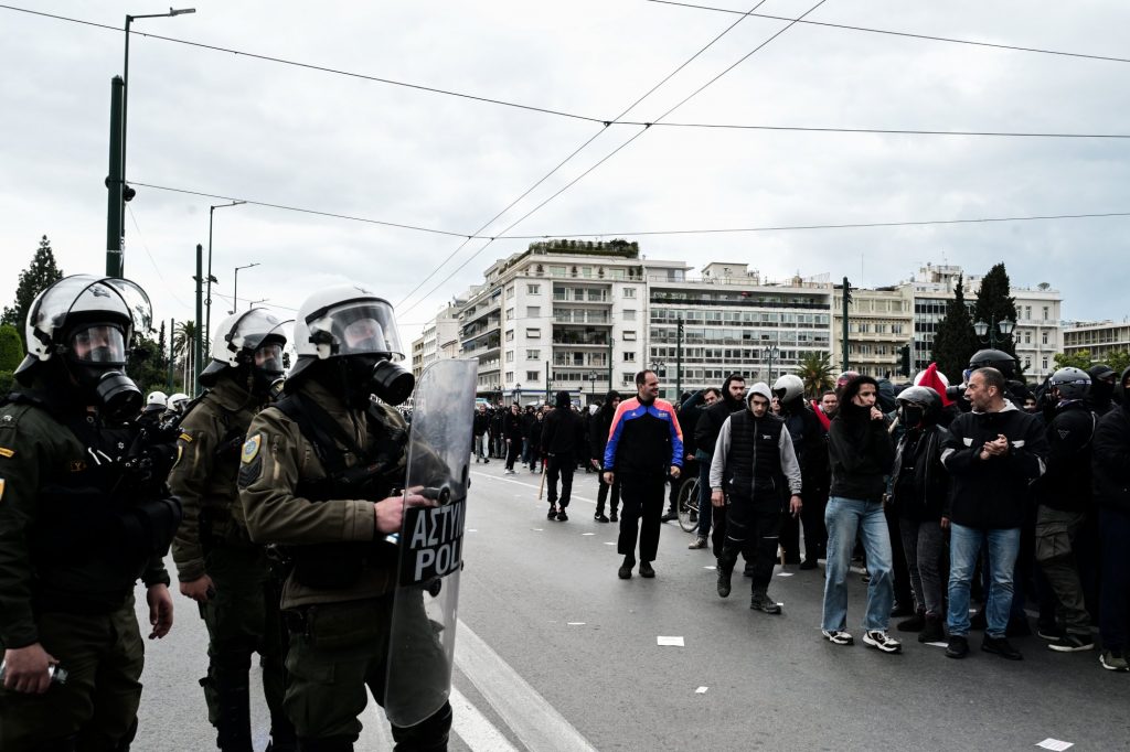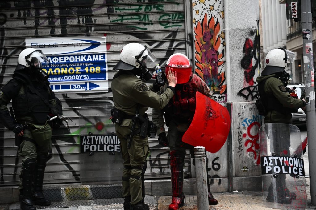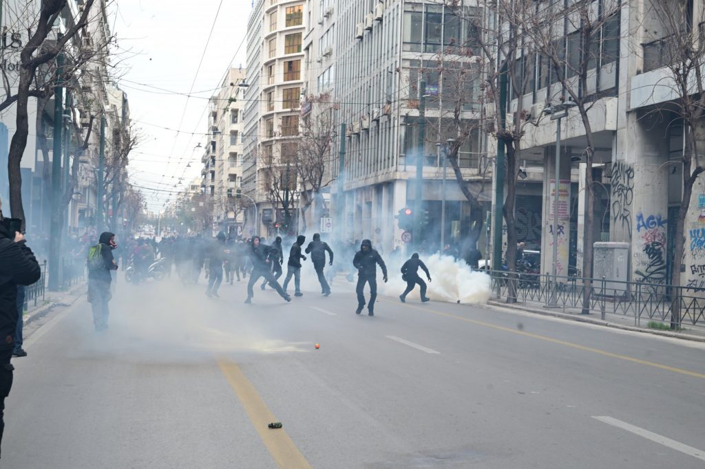 Κουκουλοφόροι πέταξαν μολότοφ και πέτρες προς τις αστυνομικές δυνάμεις, οι οποίες απάντησαν με χειροβομβίδες κρότου λάμψης και χρήση χημικών.
