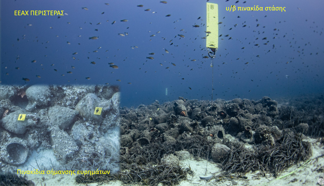 ΕΕΑΧ Περιστέρας: Η νησίδα Περιστέρα βρίσκεται ανατολικά της Αλοννήσου, εντός του θαλάσσιου πάρκου των Βόρειων Σποράδων . Κοντά στη δυτική βραχώδη ακτή του και σε βάθος 22 έως 30 μέτρα, το 1985 ανακαλύφθηκε από ψαρά το αρχαίο ναυάγιο. Πρόκειται για μεγάλη συγκέντρωση οξυπύθμενων – εμπορικών αμφορέων που υπερβαίνουν τους 3.500 και αποτελούσαν το κύριο φορτίο αρχαίου εμπορικού πλοίου. Αναγνωρίστηκαν δύο τύποι αμφορέων που προέρχονται από τη Μένδη και την Πεπάρηθο (Σκόπελο) και πιθανόν μετέφεραν οίνο. Στα ευρήματα συγκαταλέγονται, επίσης, πολυτελή αγγεία (μελαμβαφείς κύλικες και πινάκια) που αποτελούσαν δευτερεύον φορτίο, αγγεία καθημερινής χρήσης (λύχνοι, ιγδίο κ.α.) του πληρώματος, και αντικείμενα που σχετίζονταν με τον εξαρτισμό του πλοίου (μολύβδινα εξαρτήματα άγκυρας και καρφιά). Βάσει των ευρημάτων το ναυάγιο χρονολογείται στο τελευταίο τέταρτο του 5ου αιώνα π.Χ.