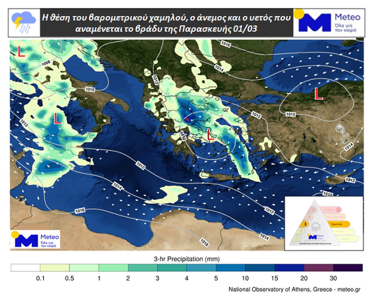 Η θέση του βαρομετρικού χαμηλού, ο υετός και ο άνεμος που αναμένονται το βράδυ της Παρασκευής 01/03