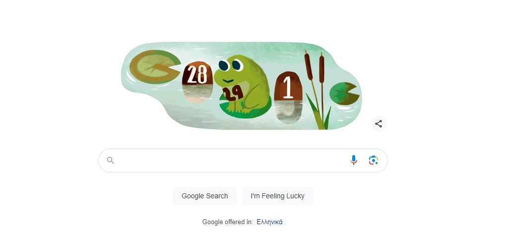 Ειδικότερα, φαίνεται ένα βατραχάκι που κάθεται σε ένα νούφαρο με τον αριθμό 29, ανάμεσα στο 28 και το 1. Αν μάλιστα, κλικάρετε πάνω του θα σας μεταφέρει στη σημερινή ημερομηνία, Πέμπτη 29 Φεβρουαρίου του 2024, ή αλλιώς Leap Day 2024.