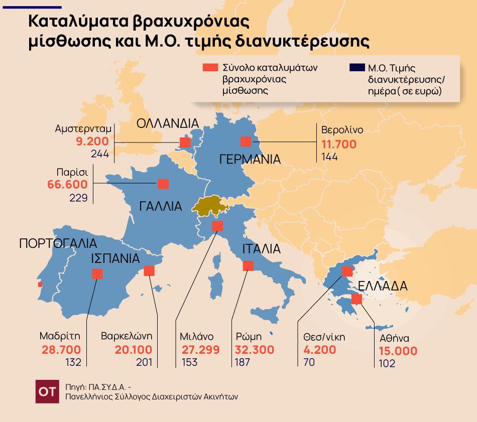 Σύμφωνα με στοιχεία του ΠΑΣΥΔΑ (Πανελλήνιο Σύλλογο Διαχειριστών Ακινήτων) η τιμή στην ελληνική πρωτεύουσα για ένα μέσο κατάλυμα διαμορφώνεται στα 102 ευρώ την ημέρα ενώ στην Ρώμη φθάνει στα 187 ευρώ, στην Μαδρίτη στα 132 ευρώ, στο Παρίσι στα 229 ευρώ και στο Βερολίνο στα 144 ευρώ.