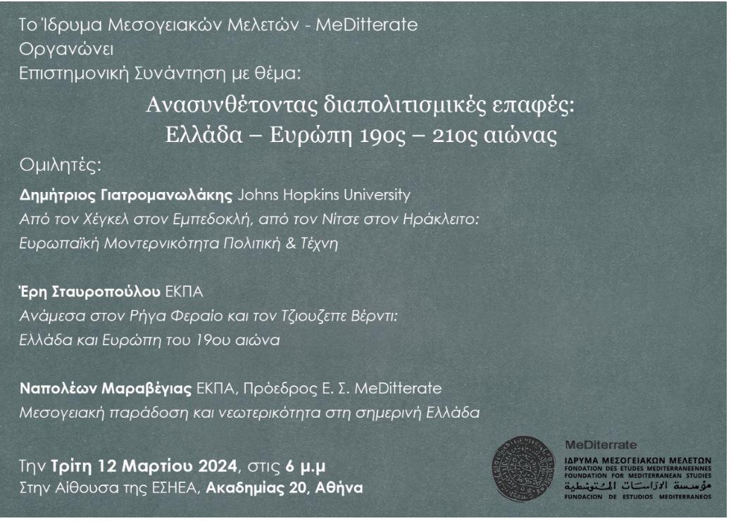 Το Ίδρυμα Μεσογειακών Μελετών, MeDitterate οργανώνει επιστημονική συνάντηση με θέμα «Ανασυνθέτοντας διαπολιτισμικές επαφές: Ελλάδα- Ευρώπη 19ος- 20ος αιώνας».