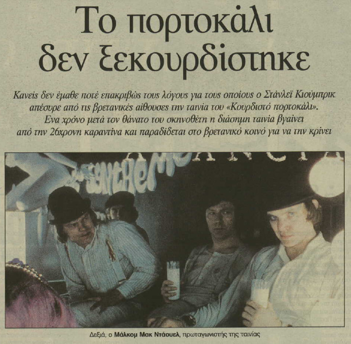«Το ενδιαφέρον για το Διεθνές Φεστιβάλ Κινηματογράφου τονώθηκε ξαφνικά σήμερα το βράδυ με την προβολή της ταινίας του Στάνλεϋ Κιούμπρικ “Το κουρδιστό πορτοκάλι”.