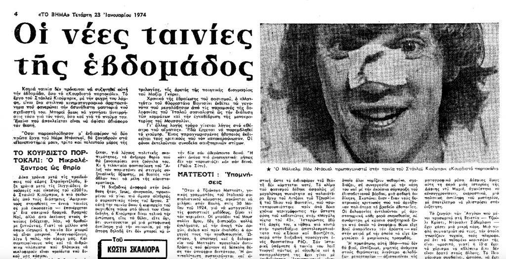 Λίγους μήνες αργότερα, αρχές του 1973, «ΤΟ ΒΗΜΑ» της 23ης Μαρτίου αναφέρεται στα εμπόδια που θέτει στη διανομή ταινιών στην Ελλάδα η χουντική λογοκρισία.