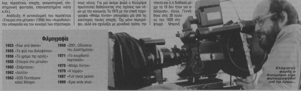 »Ο μύθος του Κιούμπρικ “φτιάχτηκε” από τα έργα του. Κάθε τίτλος και μια σφραγίδα με ανεξίτηλα χρώματα. Με κάθε ταινία του αλλάζει όλα τα δεδομένα και κουρελιάζει τις χολιγουντιανές συνταγές των “ειδών” (πολεμική, θρίλερ, περιπέτεια, εποχής, γκαγκστερική, επιστημονική φαντασία, επαναστατημένα νιάτα κ.λπ.