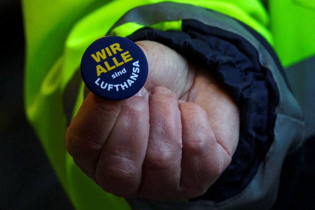 Ένας υπάλληλος της Lufthansa κρατάει ένα σήμα που γράφει “Είμαστε όλοι Lufthansa”, καθώς το αεροδρόμιο της Φρανκφούρτης είναι κλειστό για τους επιβάτες με προγραμματισμένες αναχωρήσεις λόγω απεργίας που οργανώθηκε από το συνδικάτο Verdi, στη Φρανκφούρτη της Γερμανίας, 7 Μαρτίου 2024. REUTERS/Kai Pfaffenbach