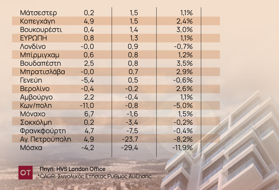Συνολικά, οι περισσότερες αγορές παρέμειναν κάτω από την τιμή αναφοράς του 2019, ενώ μόνο το Άμστερνταμ, η Αθήνα, το Δουβλίνο και το Παρίσι έχουν ανακάμψει πλήρως στις προ της πανδημίας τιμές.