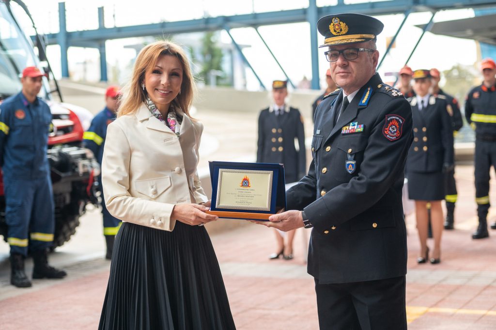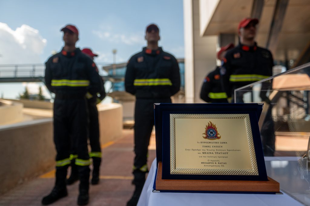 Ο Αρχηγός του Πυροσβεστικού Σώματος Αντιστράτηγος Θεόδωρος Βάγιας, ως ένδειξη εκτίμησης απένειμε τιμητική πλακέτα στην Πρόεδρο της Ένωσης Ελλήνων Εφοπλιστών, Μελίνα Τραυλού, και ευχαρίστησε την ΕΕΕ τονίζοντας ότι: «η διαχρονική στήριξή σας και η σημερινή προφορά σας, ενισχύουν τις επιχειρησιακές δυνατότητες του Πυροσβεστικού Σώματος και διευκολύνουν σημαντικά το έργο μας».