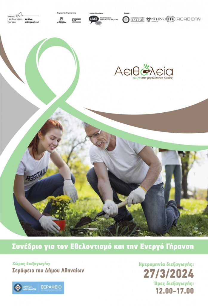 Στο πλαίσιο της ολοκλήρωσης του έργου «Αειθαλεία : Ολιστικό πρόγραμμα για τον εθελοντισμό ατόμων τρίτης ηλικίας και την ενεργή συμμετοχή τους στα κοινά», η ΕΛΙΞ-Προγράμματα Εθελοντικής Εργασίας, ως φορέας υλοποίησης και οι εταίροι Πανεπιστήμιο Πατρών, Proopsis Consulting S.A. και OTEAcademy σας προσκαλούν στο Συνέδριο για τον Εθελοντισμό και την Ενεργό Γήρανση, το οποίο θα πραγματοποιηθεί στο Σεράφειο του Δήμου Αθηναίων (Εχελιδών 19 & Πειραιώς 144, Αθήνα), την Τετάρτη 27 Μαρτίου, ώρα 12.00μμ – 17.00μμ.