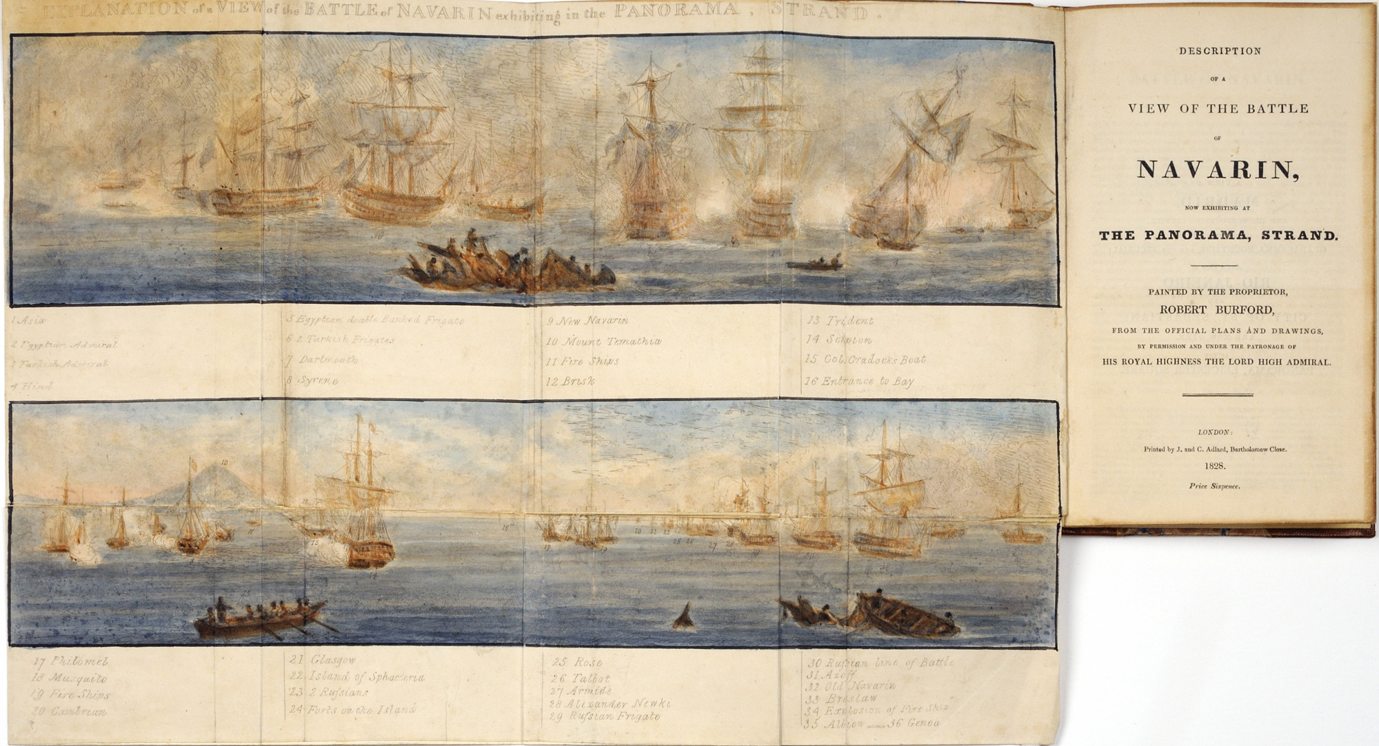 Robert Burford (1791-1861). Περιγραφή μια άποψης της Ναυμαχίας του Ναβαρίνου που εκτίθεται τώρα στο Πανόραμα, επί του Strand. Φιλοτεχνημένη […] από τους επίσημους χάρτες και σχέδια […], Λονδίνο 1828