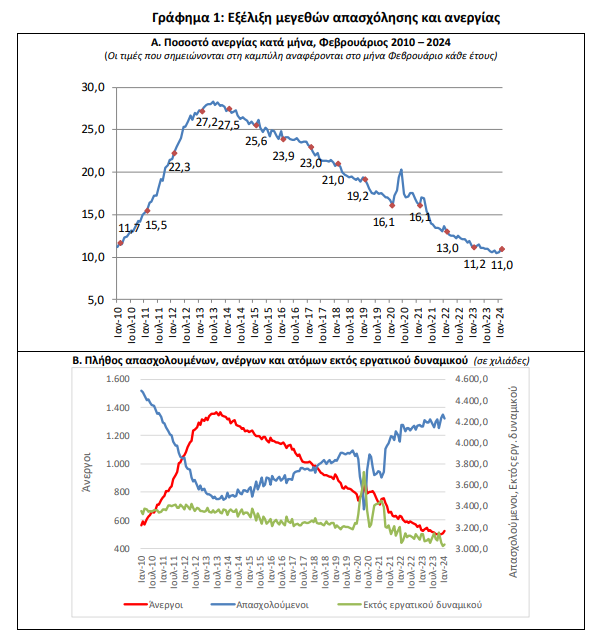 Οι άνεργοι ανήλθαν σε 524.428 άτομα σημειώνοντας μείωση κατά 283 άτομα σε σχέση με τον Φεβρουάριο του 2023 (-0,1%) και αύξηση κατά 18.733 άτομα σε σχέση με τον Ιανουάριο του 2024 (3,7%).