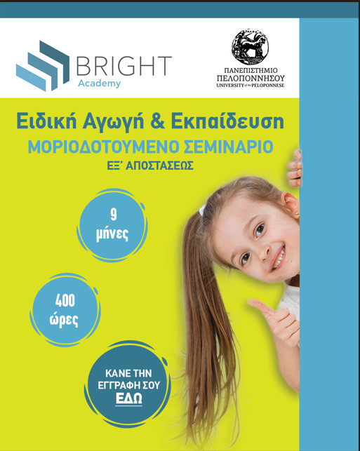 Η Bright Academy στα πλαίσια της διαρκούς εκπαίδευσης, και αφουγκραζόμενη τις εκπαιδευτικές ανάγκες, σε συνεργασία με το Πανεπιστήμιο Πελοποννήσου υλοποιεί μοριοδοτούμενα σεμινάρια στην Ειδική Αγωγή. Η έναρξη των μαθημάτων του πρώτου κύκλου είναι την Δευτέρα 8 Απριλίου 2024. Προϋπόθεση, που τίθεται, ώστε να συμμετάσχει κάποιος/α στο προτεινόμενο πρόγραμμα είναι να είναι απόφοιτος ΑΕΙ ή πρώην ΤΕΙ. Η συνολική διάρκεια (σε αριθμό ωρών και αριθμό εβδομάδων) είναι 400 ώρες, 40 εβδομάδες, 9 μήνες. Η μέθοδος υλοποίησης και οι διαδικασίες παρακολούθησης είναι εξ αποστάσεως ασύγχρονη εκπαίδευση. Ένα από τα βασικά πλεονεκτήματα των σεμιναρίων ειδικής αγωγής είναι η αναβάθμιση των γνώσεων και των δεξιοτήτων των εκπαιδευτικών, παρέχοντας ευκαιρίες εξοικείωσης με τις νέες τάσεις και τις καλύτερες πρακτικές στον τομέα αυτό.